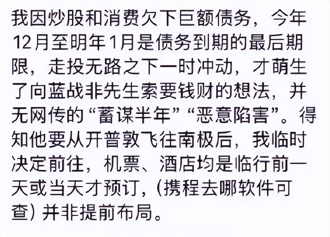 首先,自称绑匪者毫无羞愧地出现在蓝战非的粉丝会员群,虽然口口声声在对蓝战非表达歉意,可后续发文当中,主旨只是为了替自己“澄清”。
